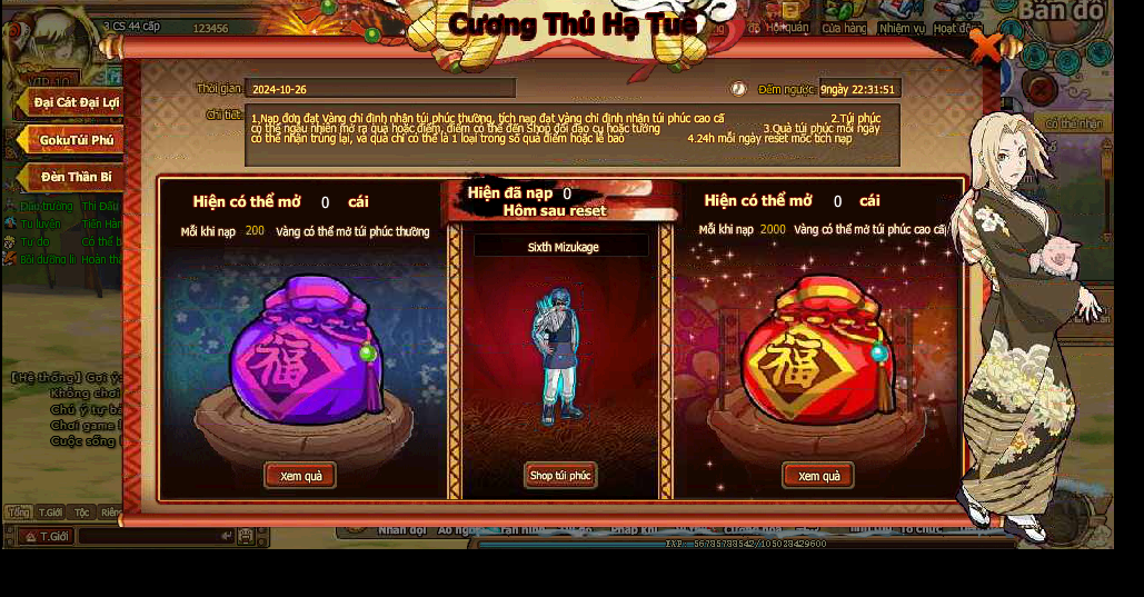 2. Túi phúc có thể ngẫu nhiên mở ra quà hoặc điểm, điểm có thể đến Shop đổi đạo cụ hoặc tướng.