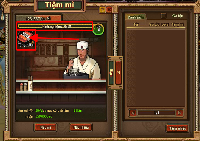 ( Hình Ảnh : Nút Tặng Nguyên Liệu Và Thanh Kinh Nghiệm Lên Cấp Của Tiệm Mì )